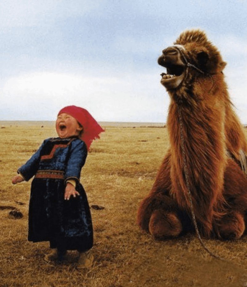 Эта фотография, сделанная талантливым китайским фотографом Ли Ханьчэном (Li Hancheng), принесла ему в 2004 году одну из самых престижных национальных фотографических премий. Снимок под названием «Смех в пустыне» (или «Смеющаяся девочка-монголка») запечатлел трогательный и искренний момент дружбы между маленькой монгольской девочкой и верблюдом в бескрайних монгольских степях.